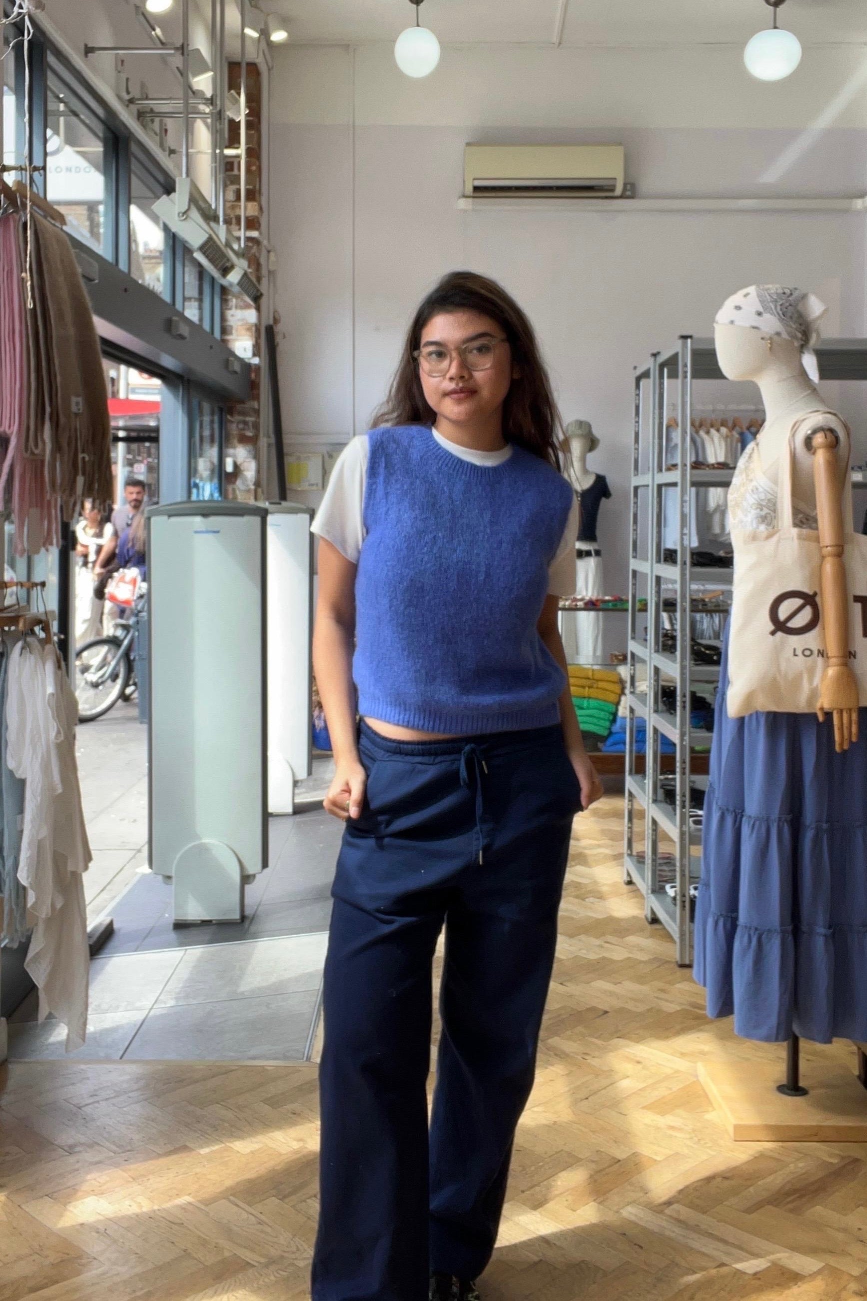Relaxed straight legs carpenter trousers with drawstring and pockets in Navy Blue. The trousers have an oversized workwear wear look.