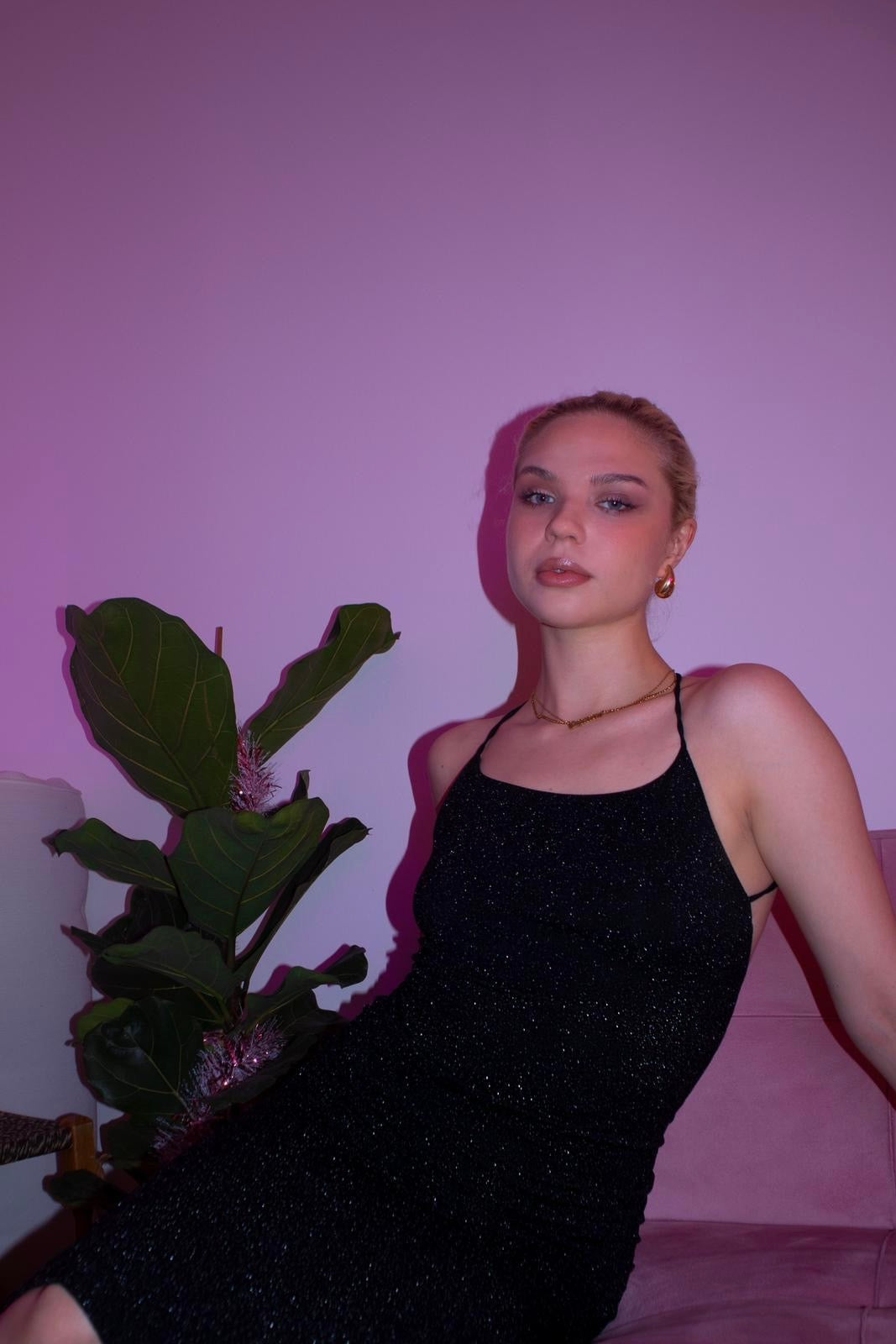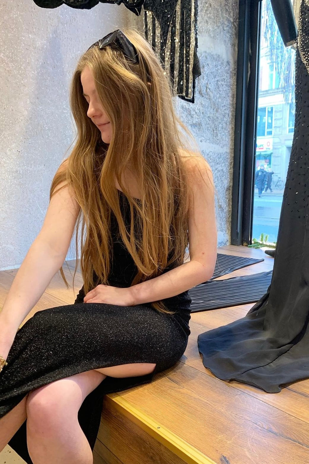 Esther glittery and sparkly medi slip dress with cross straps and low back.