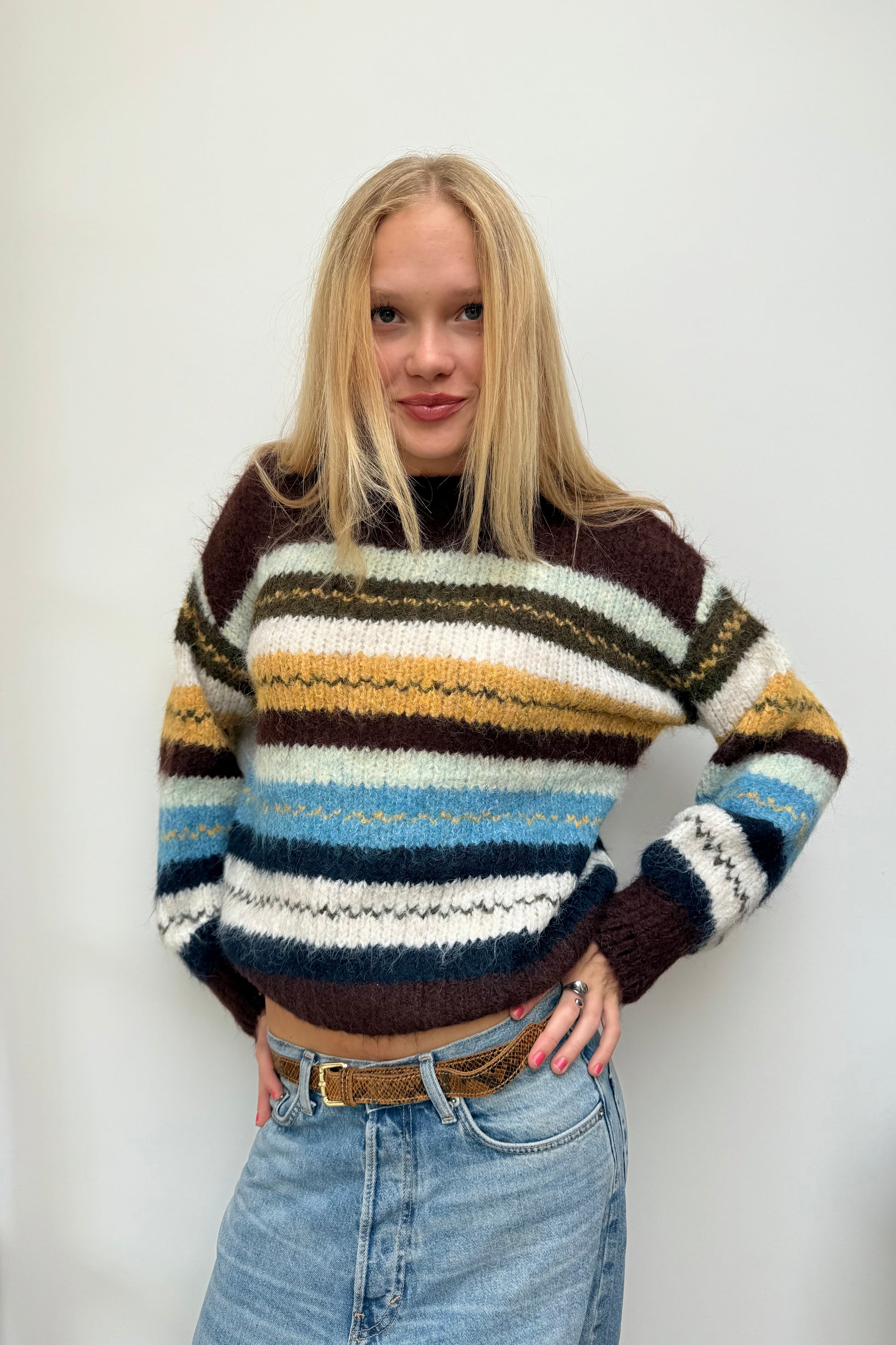 Cosy meets colourful in our striped wool blend jumper. Knitted in soft, fluffy yarn, it features a relaxed fit with a classic crew neckline and ribbed trims. The bold mix of stripes makes it a cheerful staple you’ll reach for season after season.