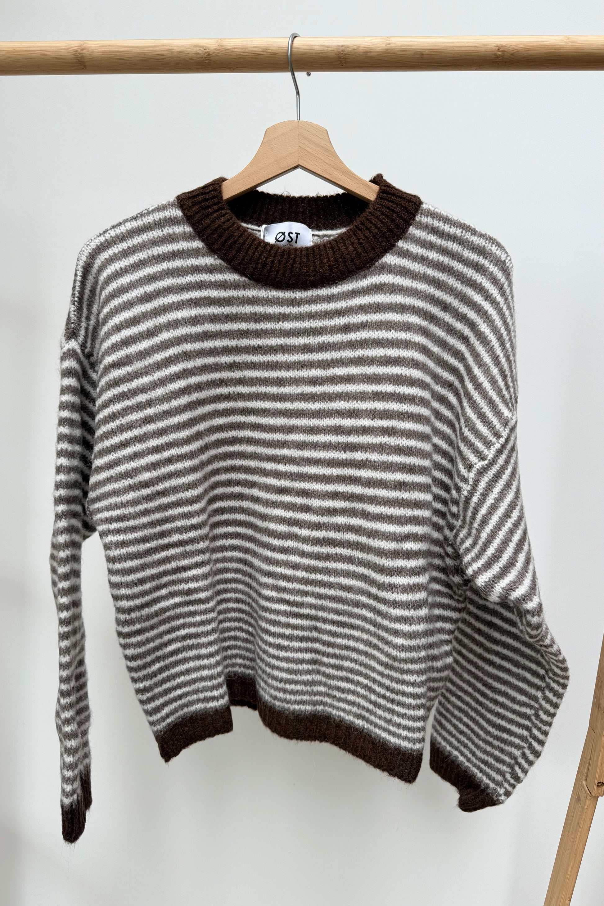 A cosy classic with a playful twist. The Nanna Knit is crafted in soft, breathable yarn with bold coffee and cream stripes, finished with a contrast brown trim at the neck, cuffs, and hem. Its relaxed, slightly boxy fit makes it perfect for layering over dresses or pairing with your favourite jeans for easy, everyday style.